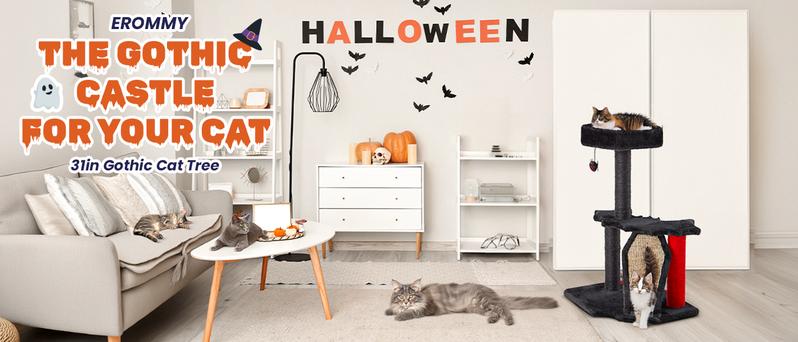 EROMMY 29" Gothic Multi-Level Cat Tree, Small Indoor Cat Tower with Bat Wings Platform, Scratching Posts, Hanging Toy & Cozy Perch, Halloween Black & Red
